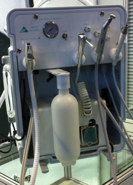 Die mobile Behandlungseinheit bildet das Kernstück der Praxisausstattung. Die Einheit ist mit einer Drei-Weg-Spritze (Schlauch und Spritze abnehmbar) ausgestattet. Der elektrische Mikromotor mit Licht leistet 0 - 40.000 Umdrehungen. Alle Instrumentenschläuche sind abnehmbar, außerdem ist ein elektrischer Zahnsteinentferner integriert. Ein Luft.- und Wasserregler für jedes Instrument ist Standard und der Wasserbehälter für das in sich geschlossene Spraywassersystem faßt 1000 ml.